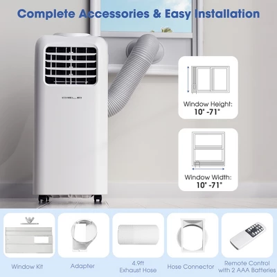 - Complete Accessories & Easy Installation: Equipped with an adjustable window kit, adapter, 4.9ft exhaust hose, hose connector and a remote control with 2 AAA batteries, this portable air conditioner is easy to install and use. And it is suitable for either vertical or horizontal sliding windows (window height/width: 10”-71”).