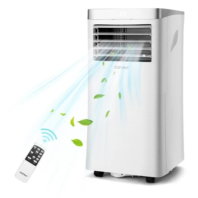 Enjoy the coolness and convenience brought by our 3-in-1 portable air conditioner!The compact 8000 BTU 10000 BTU air conditioner delivers fast cooling for spaces up to 350 square feet in your home, office, dormitory or garage. You can select the desired mode among the cooling, dehumidifying and ventilating to make the living space cool, clean and dry. Besides, there is a low-noise sleep mode and 1-24h timer for you to enjoy a peaceful sleep while saving energy. Besides, in sleep mode, the temperature will increase by 33.8 ° F every hour to prevent you from getting colds. 2 wind speeds and horizontal/vertical oscillation can evenly cool your room and meet different needs. This portable air conditioner features a smart touch panel plus an easy-to-read LED display and includes a handy remote control for easy operation. Moreover, 4 smooth rolling wheels make it easy to move around and bring you coolness in time.